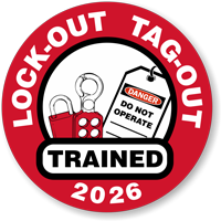 Make everyone know who your authorized employees are for lockout tagout procedures. "LOCK-OUT TAG-OUT TRAINED" (Select Year) Hard Hat Decals help prevent injury to employees who are servicing machines and equipment.