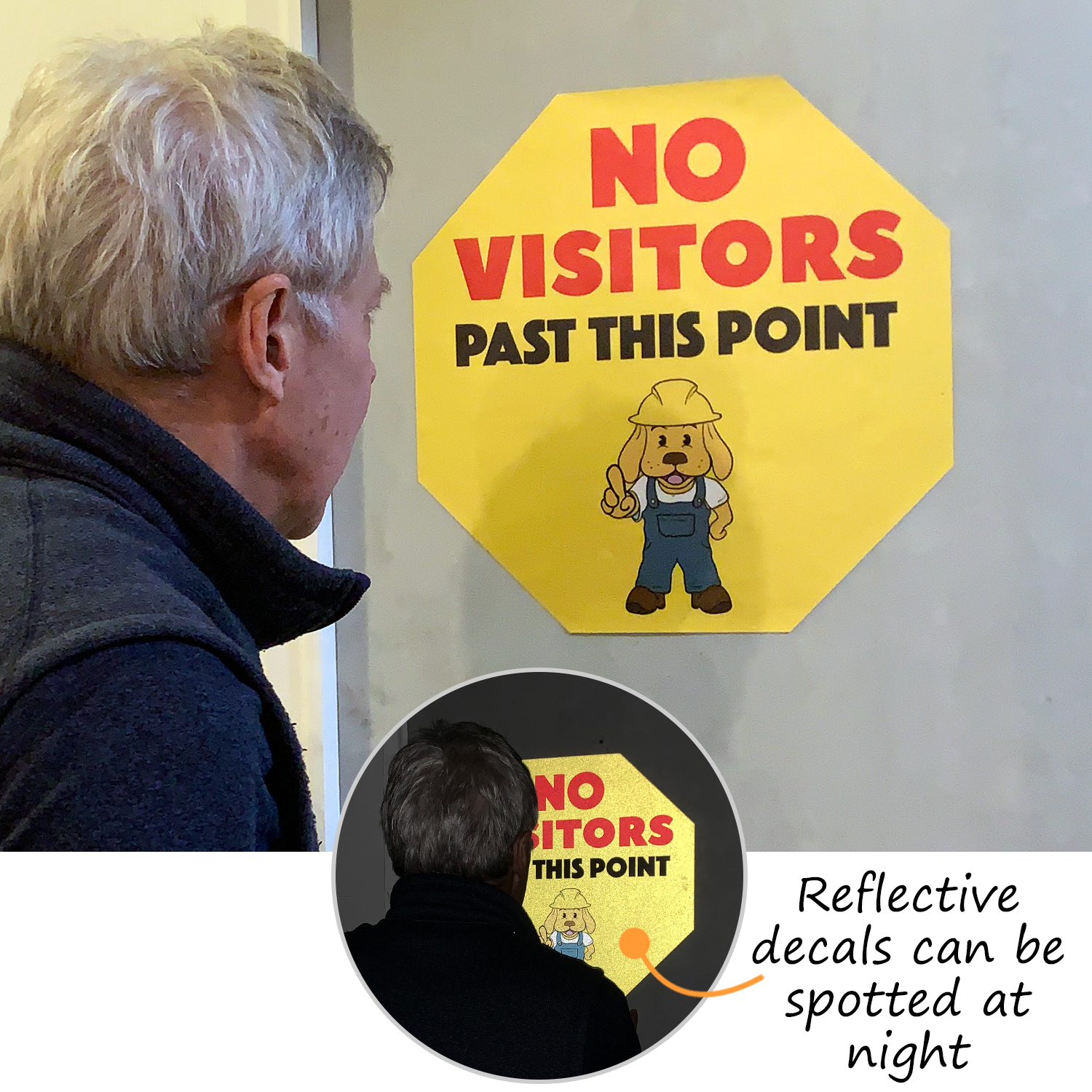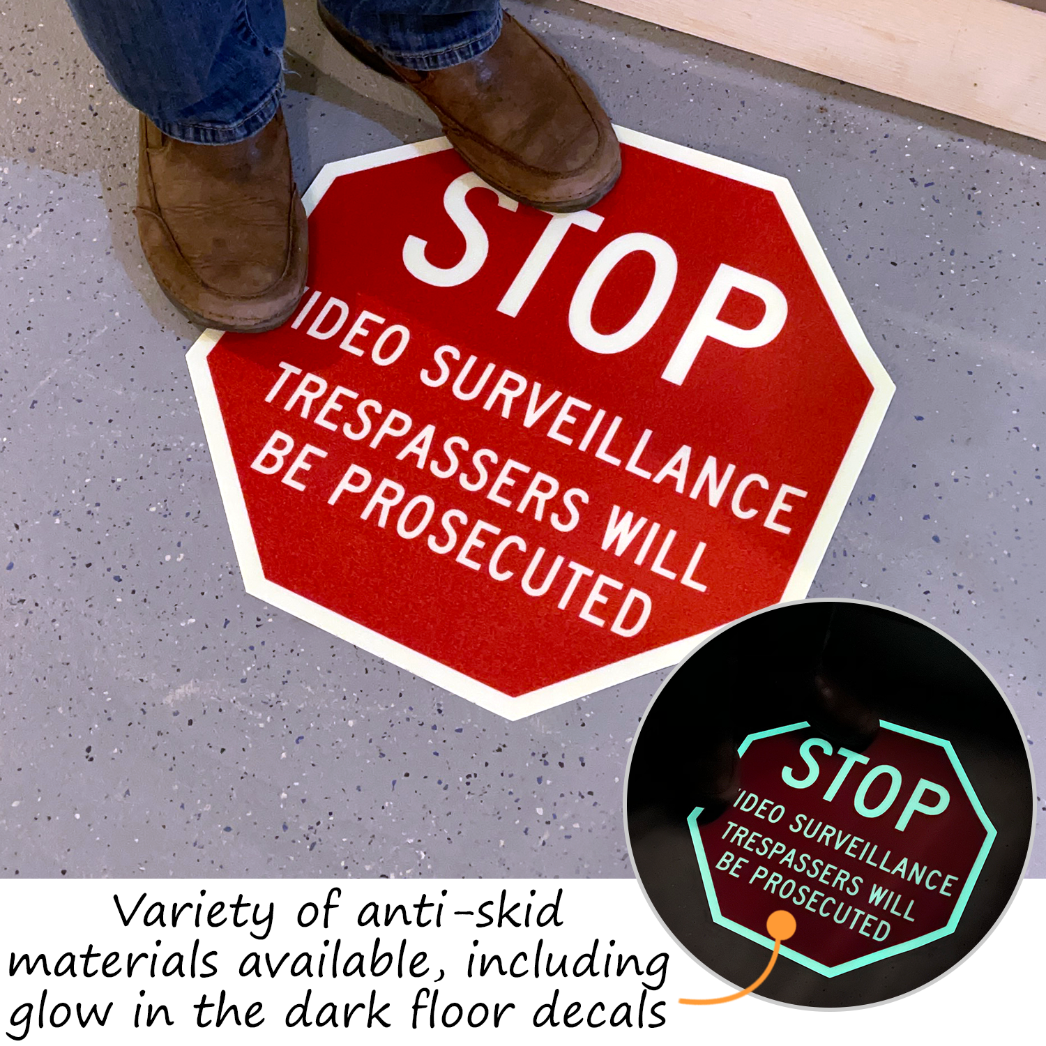We offer custom floor decals in three material choices - anti-skid vinyl, polyolefin, and Glow signs use GloBrite #7520 safety grade photoluminescent film. These signs are available in 18mil and 25 mil thickness, depending on the material used.