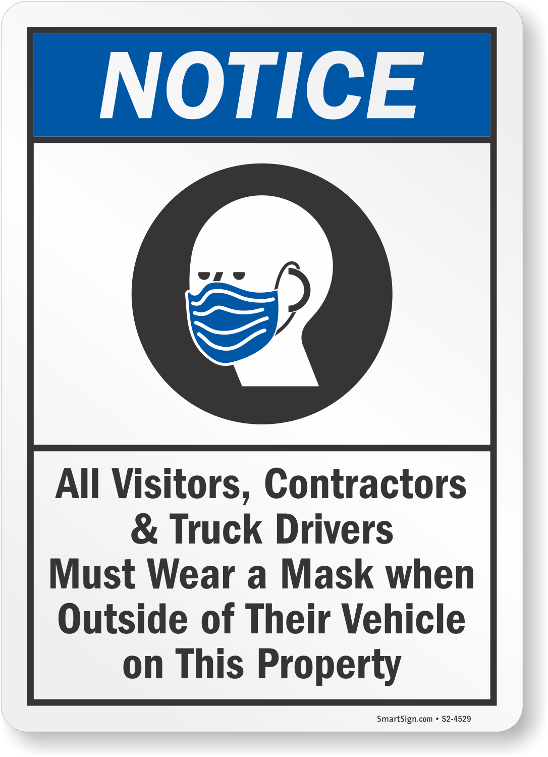 Social Distancing Sign: Notice - All Visitors, Contractors & Truck Drivers Must Wear A Mask When Outside Of Their Vehicle On This Property