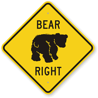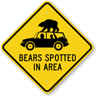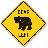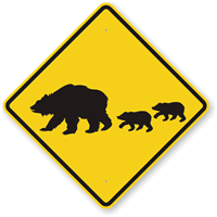 Standard bear crossing signs are yellow, diamond-shaped, and feature a black silhouette of a bear, following the MUTCD W11-1 symbol conventions. This design ensures they are recognized as a caution traffic sign by drivers from all regions.
