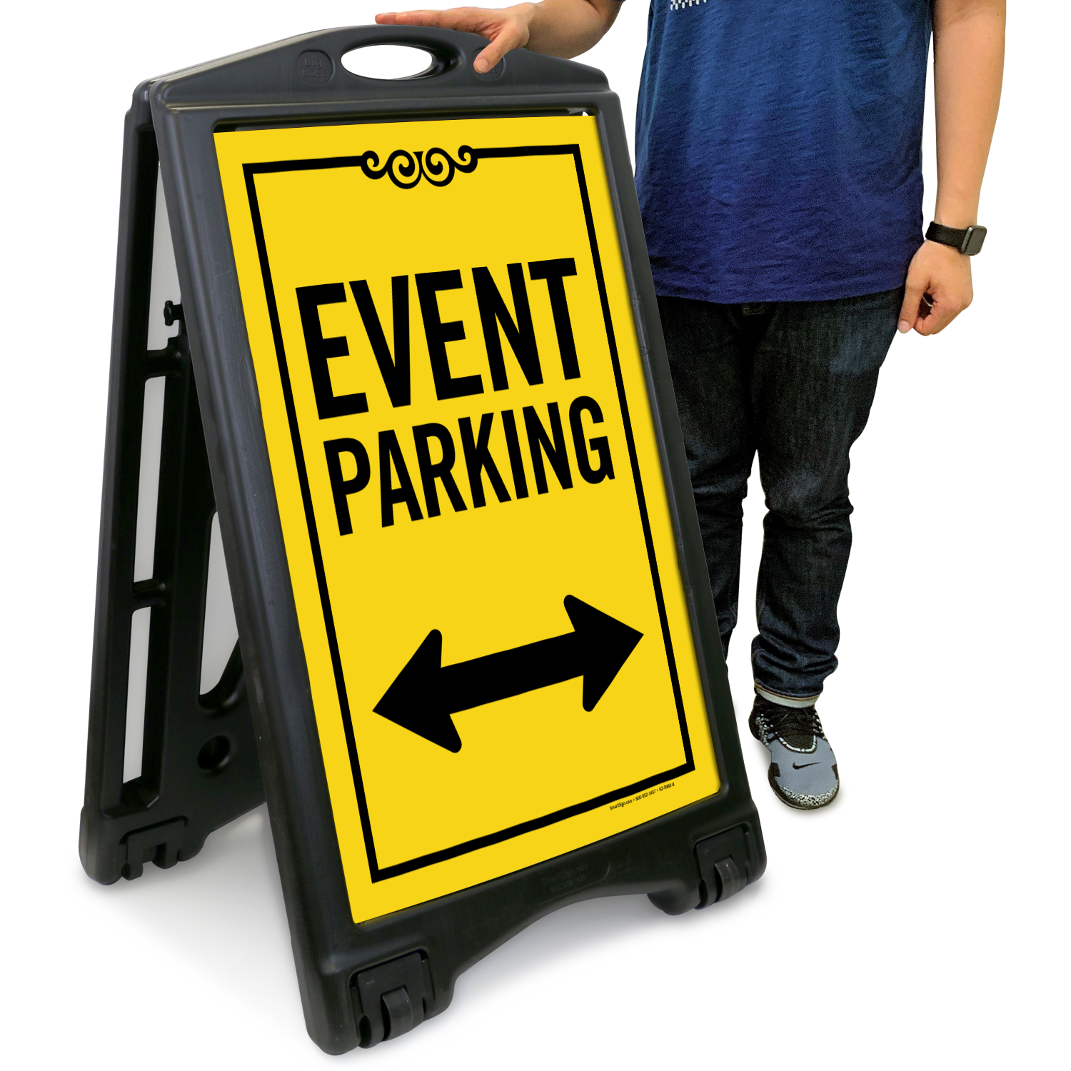 Bidirectional Event Parking Sign Panel on a yellow background with decorative border definitely grabs eyeballs. Use the sign with our very popular A-Frame Portable Sidewalk Sign Holder.