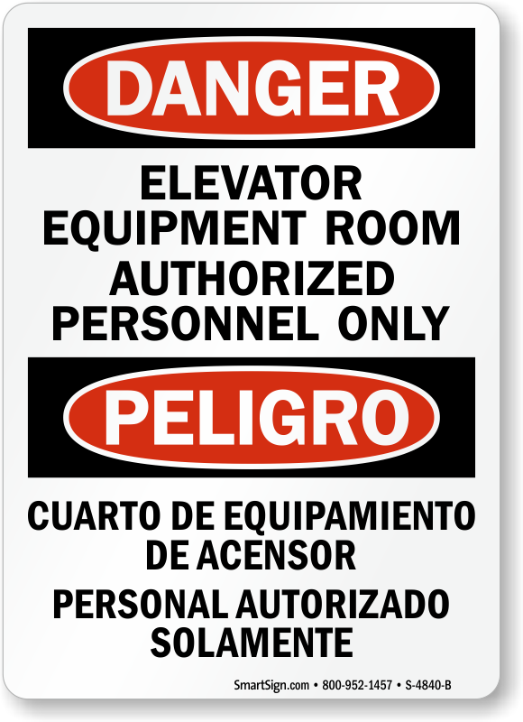 A universally understood sign leaves no chance that the message won't get across. This bilingual OSHA Danger sign identifies elevator room and permits entry of authorized personnel only.
