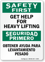 Let employees know that help is at hand! Use our Bilingual Safety First Sign and remind workers to Get Help For Heavy Lifting.