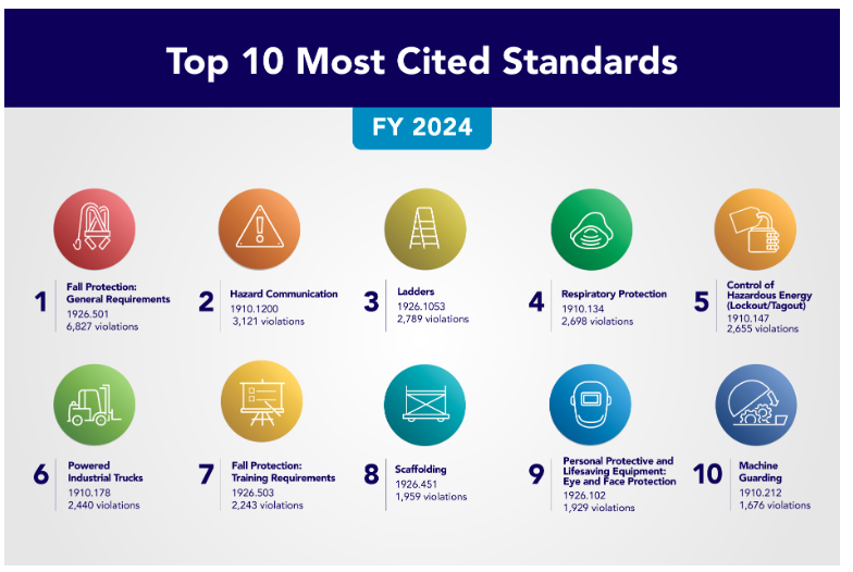 Fall Protection General Requirements has held the top spot for the 14th consecutive year, underscoring how persistent this hazard remains across industries. The encouraging news is that for all 10 categories on the list, total violation numbers decreased compared to the prior year, reflecting a growing commitment from organizations to prioritize workplace health and safety.