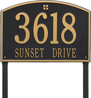 The Whitehall Products Cape Charles Estate Lawn Address Plaque (Two Lines) displays your address in style. The address plaque is made from rust free cast aluminum providing excellent quality. A classy emblem adds distinction and charm to the top of this house number sign.