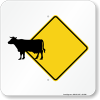 Standard signs feature a black silhouette of a cow on a yellow diamond background, which is the universally recognized W11-4 MUTCD symbol. This consistent design ensures that the caution traffic sign is immediately understood by drivers, regardless of their native language.