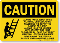 If ladders are frequently used in your facility, use this OSHA Caution sign to keep everyone aware of ladder safety. Clear ladder instructions are accompanied with a man climbing symbol which increases visibility and makes your message easy to comprehend.