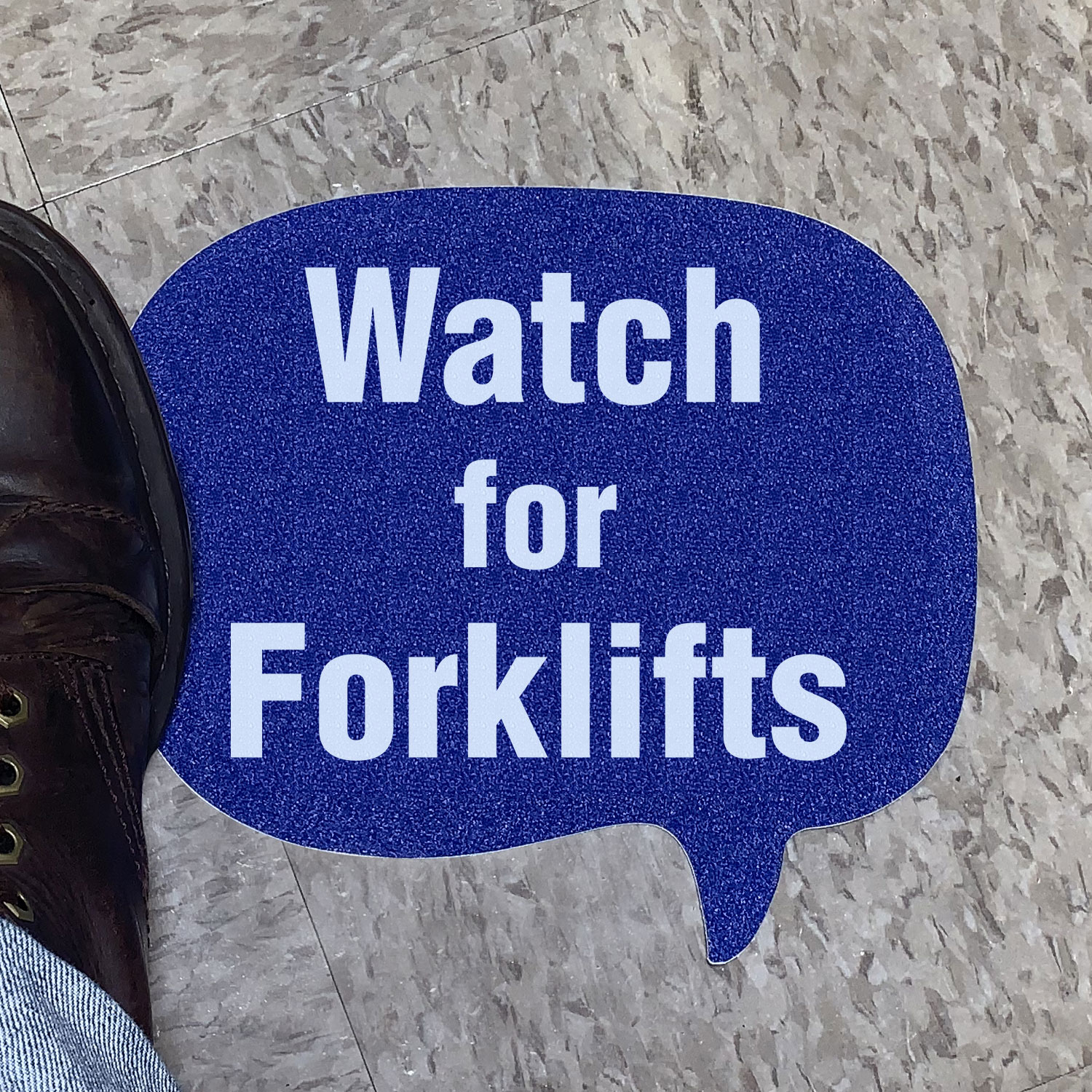 Alert people about forklifts with our unique chat bubble-shaped floor sign. Size and color options provided to suit different settings and requirements.