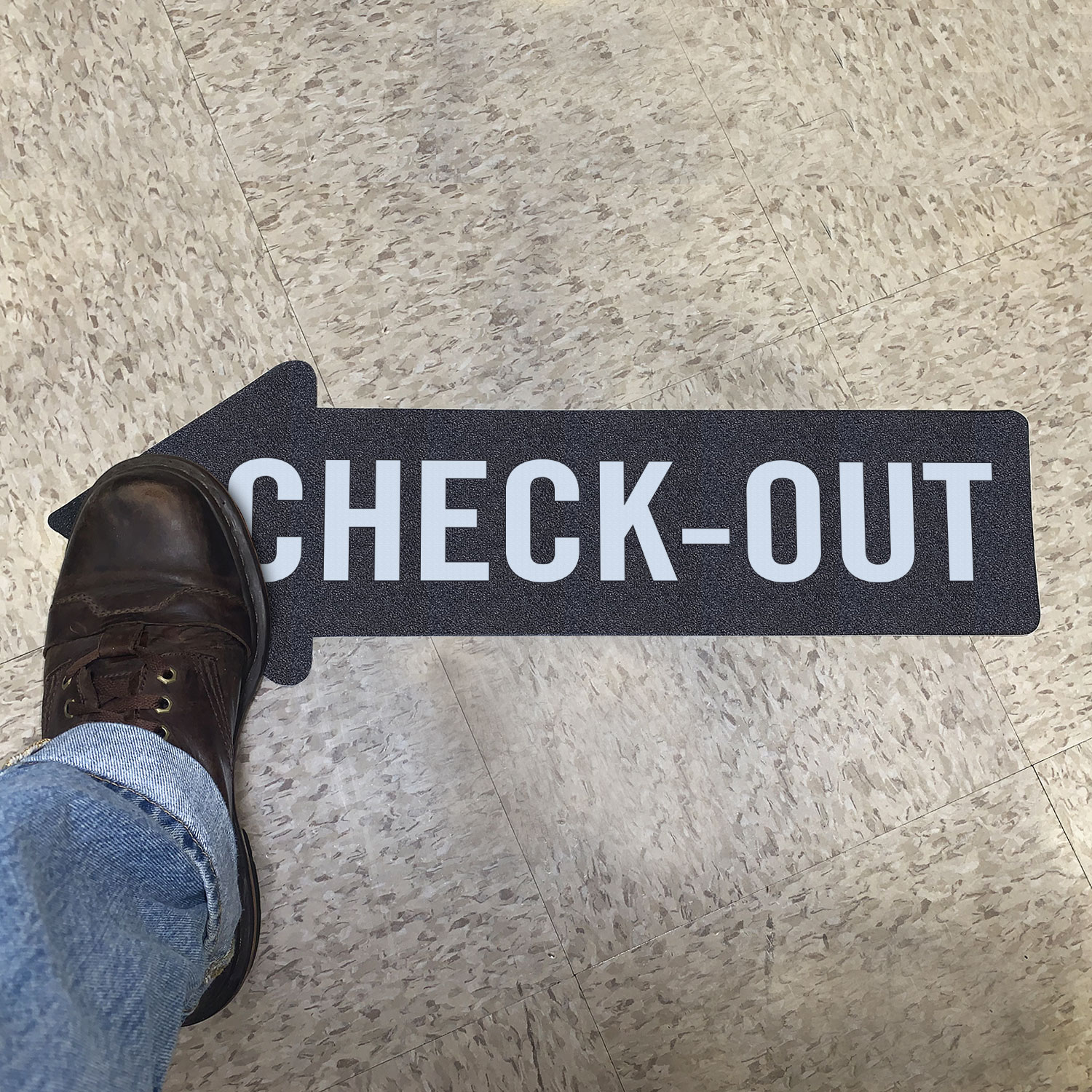 Guide people towards the check-out area with our high-visibility arrow-shaped adhesive floor sign.