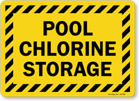 Chlorine hazard signs are chemical safety signs used to label storage areas, tanks, and pump rooms where pool chemicals are kept. They warn of dangers like "corrosive," "oxidizer," or "inhalation hazard."