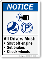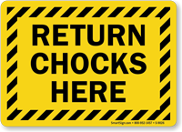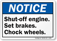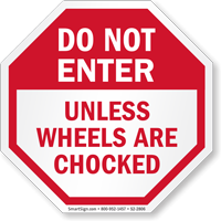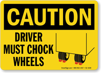 Per OSHA 1910.178, chocks prevent trucks from rolling away during loading. You can find these mandatory markers in our chock wheels signs collection.