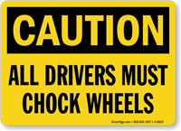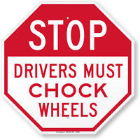 "Mirror Image" signs (with reversed text) are available and highly effective. They allow drivers looking in their rear-view mirrors to read the "Chock Wheels" message correctly without having to turn around, increasing the likelihood of compliance.