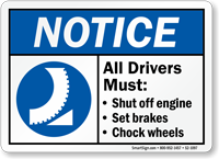 Per OSHA 1910.178, chocks prevent trucks from rolling away during loading. You can find these mandatory markers in our chock wheels signs collection.