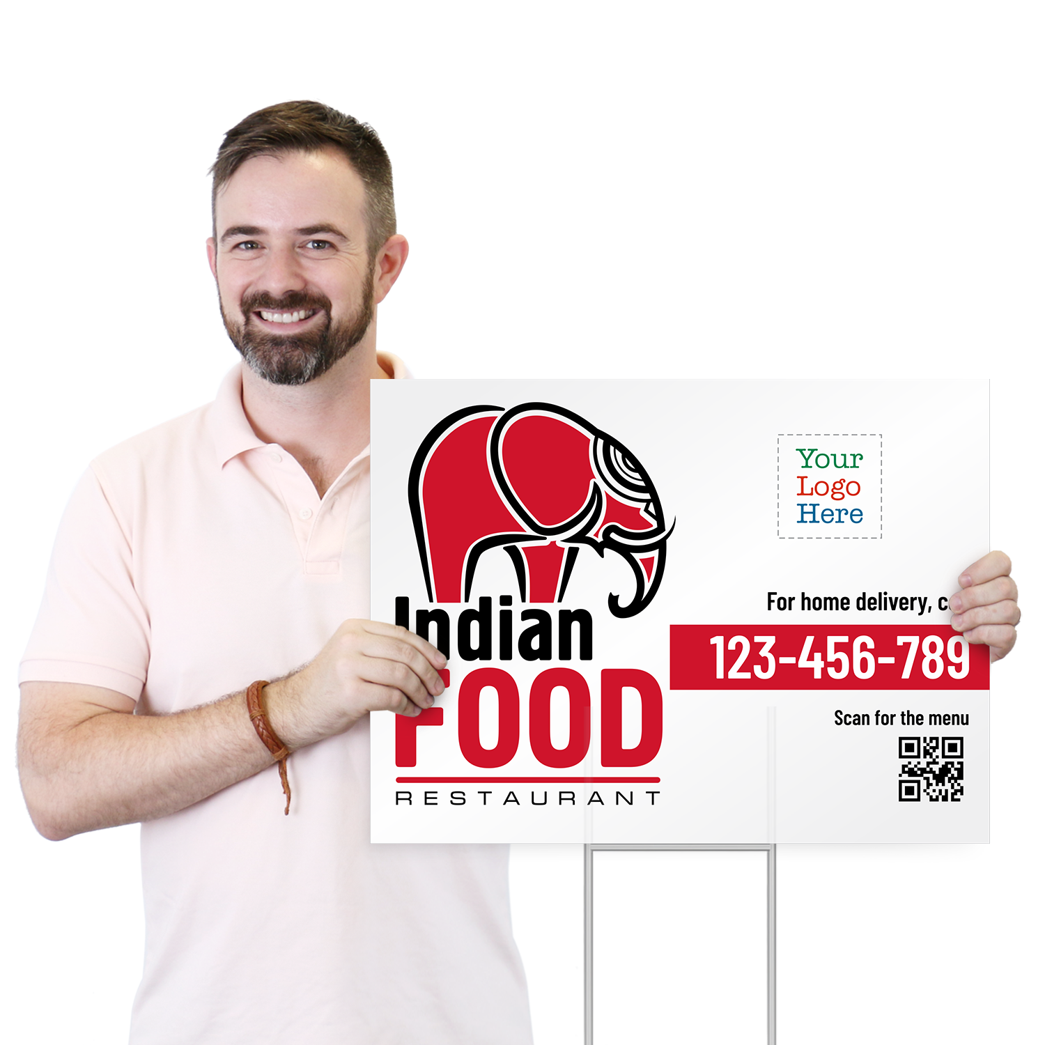 Restaurant Custom Yard Sign: Indian Food Restaurant - Add Your Contact Number For Home Delivery, QR Code And Logo K3-3019-H
