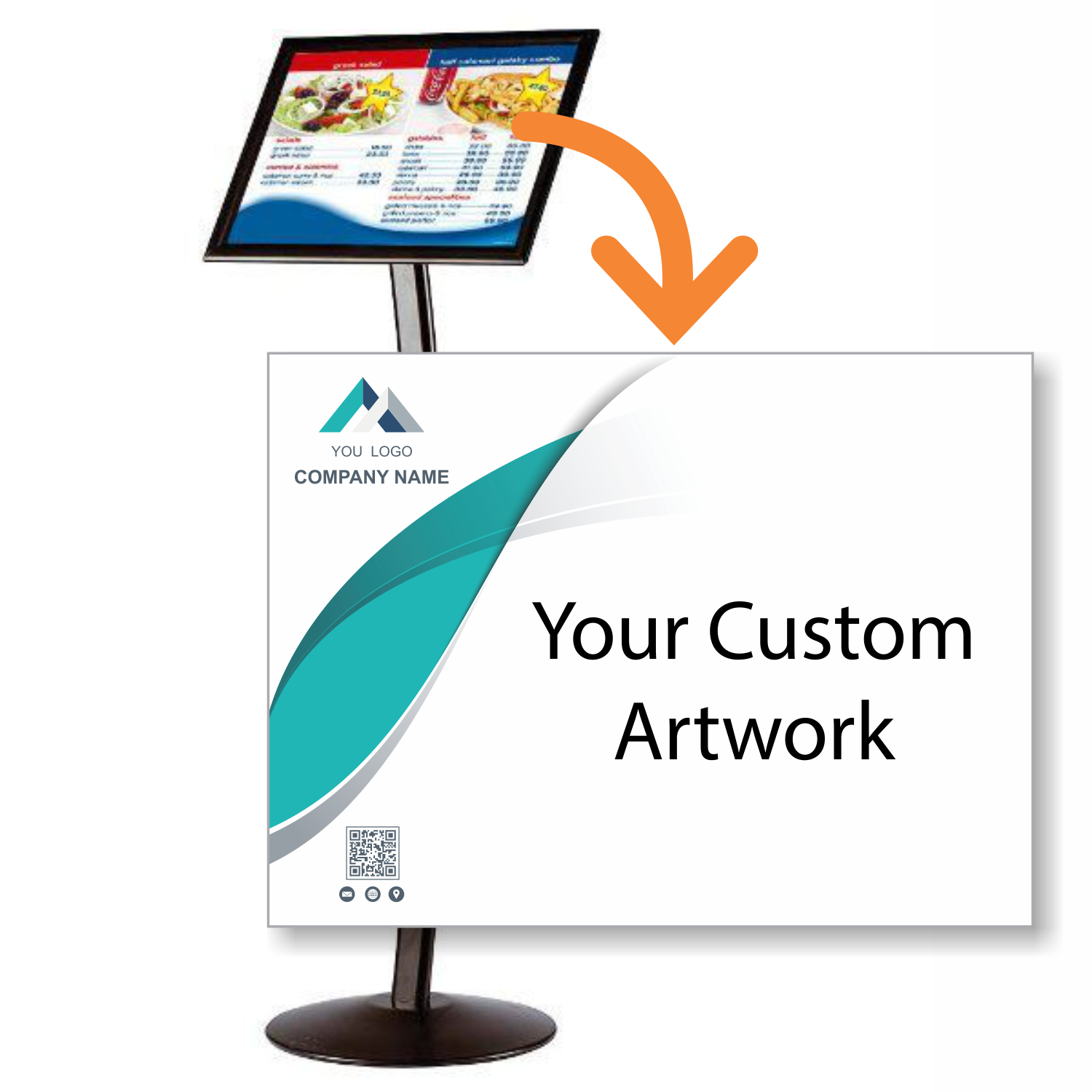 Get a complete professional display with this Custom Curved Menu Board Kit. This package includes a high-quality custom-printed insert and a premium curved pedestal stand, perfect for making a high-end first impression in lobbies and entryways.