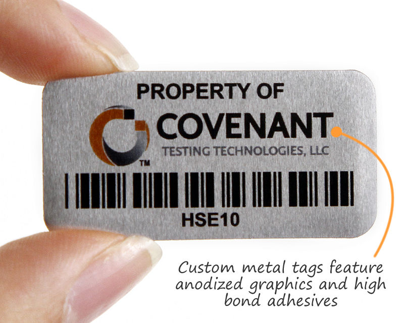 • • Metal adhesive tags are available with a variety of adhesive options. You can also add sequential numbering or barcodes. Print is protected by an anodized coating.