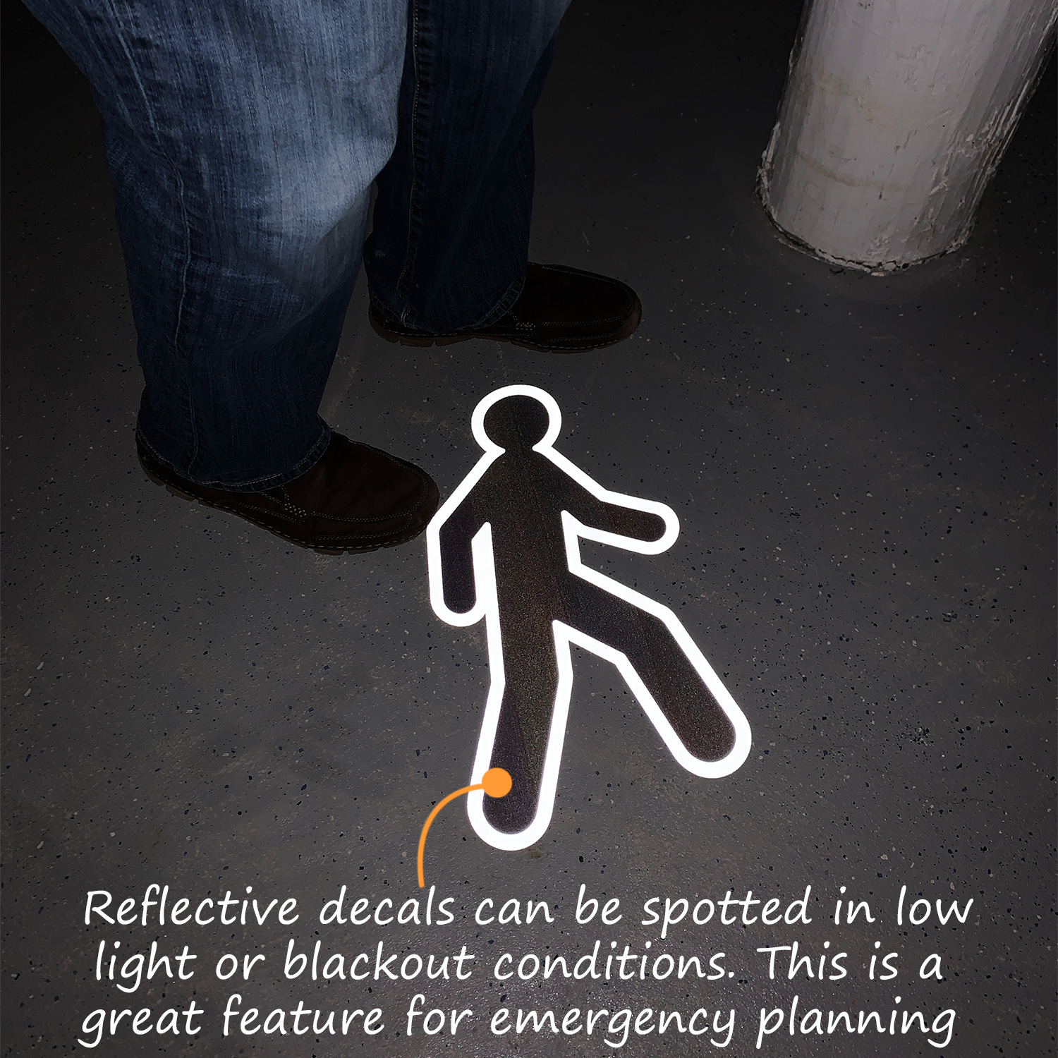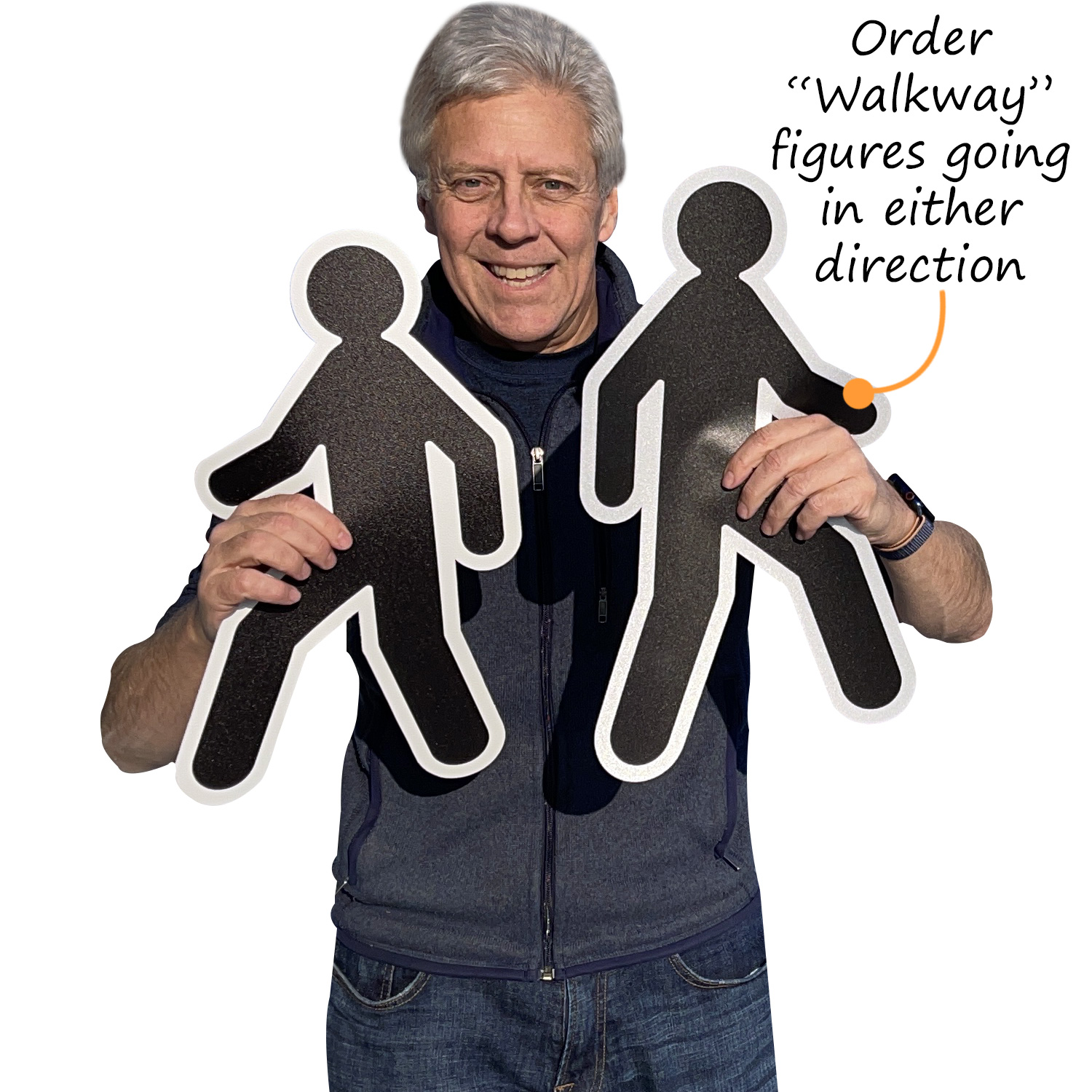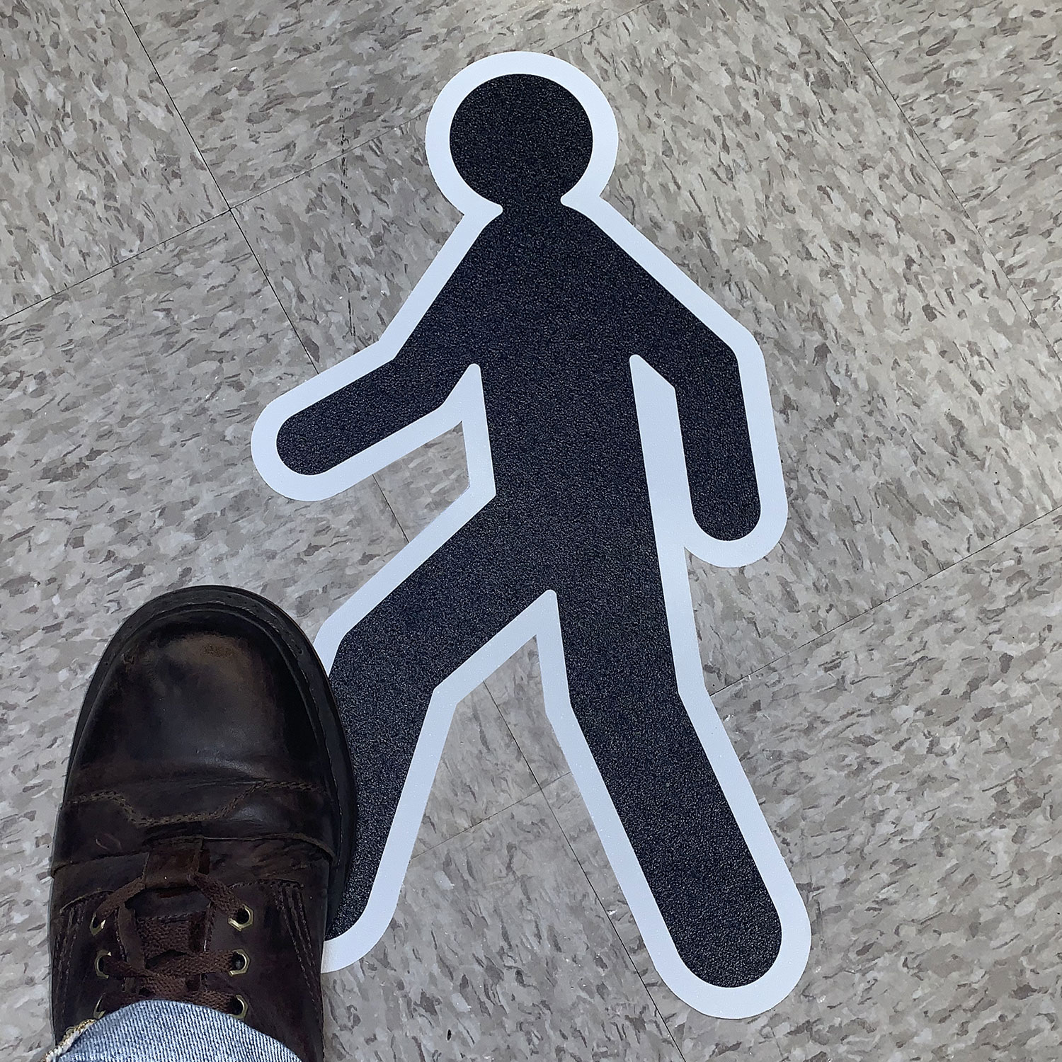 This adhesive floor sign is an efficient way to communicate pedestrian traffic flow direction. Cut-to-shape sign does not cover extra floor space and commands high visibility.