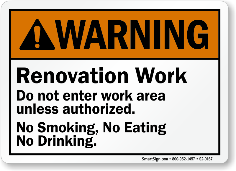 An ANSI Warning Sign keeps everyone alert in renovation area and effectively prohibits unauthorized entry in work area, smoking, eating, or drinking in the zone.