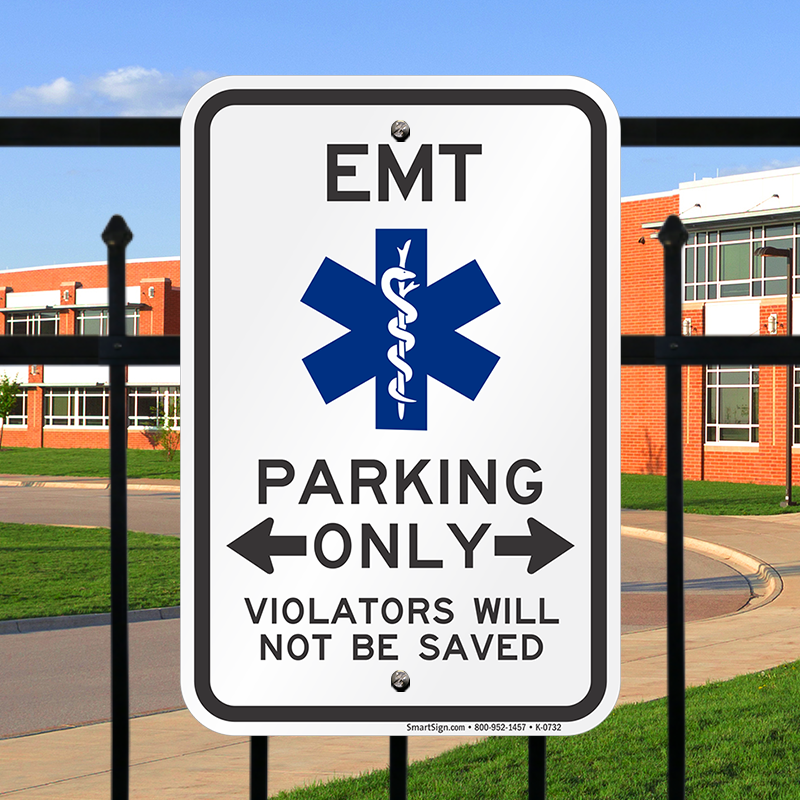 Mention your parking policy using this EMT Reserved Parking sign with a bidirectional arrow and state that action will be taken against the violators.