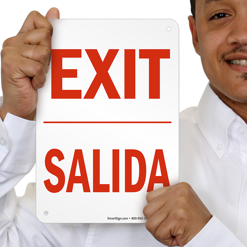 Let everyone know where the exit is. Bilingual text.