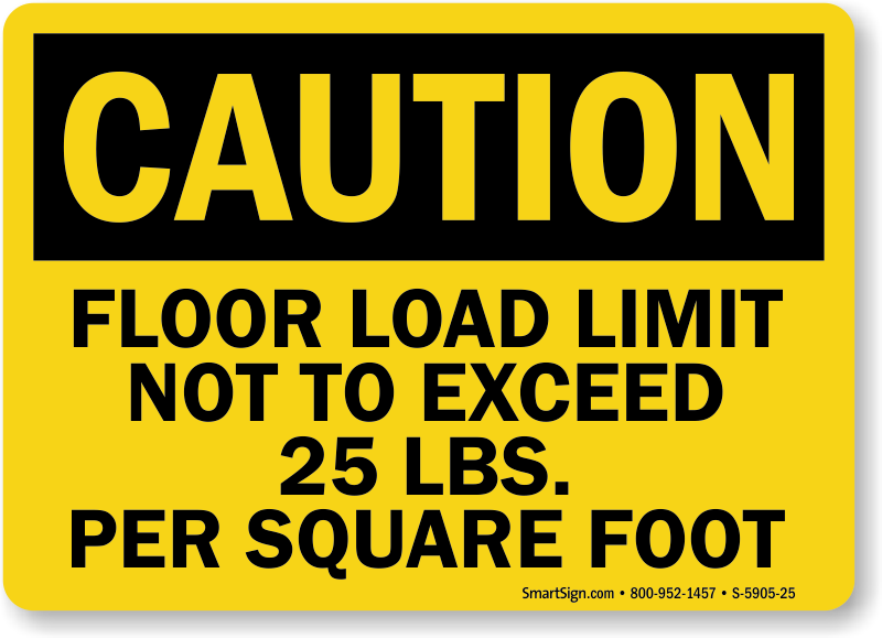 Clearly display your floor load limit and prevent accidents. Inform everyone that floor weight should be under 25 lbs per square foot with this OSHA Caution Sign.