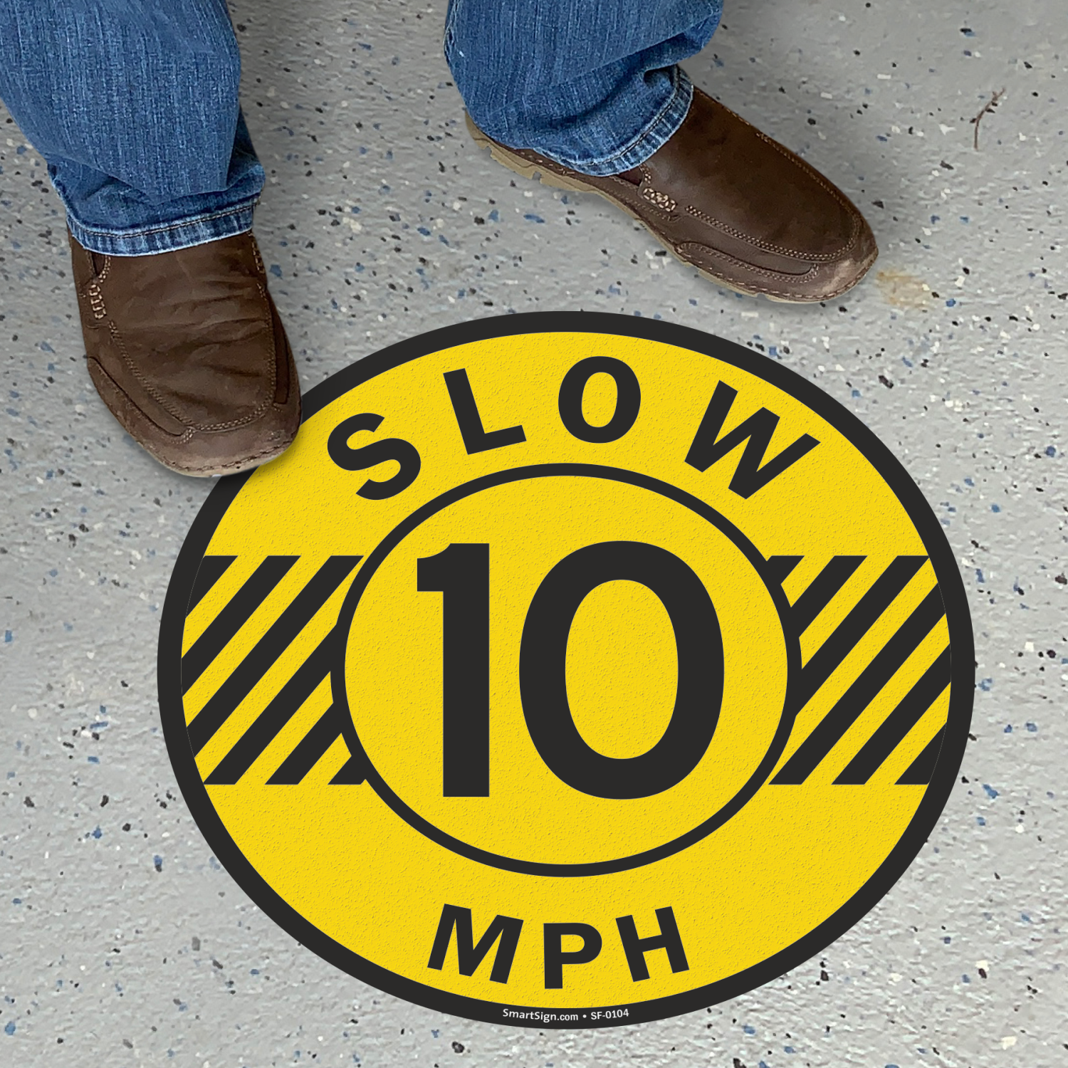 Slow down and limit your speed to 10 MPH with a warning sign that everyone will come in contact with - a Floor Sign. Made from durable vinyl and overlaid with either a pebble- or grit-coated laminate that increases surface friction upon contact to prevent slips and skids.