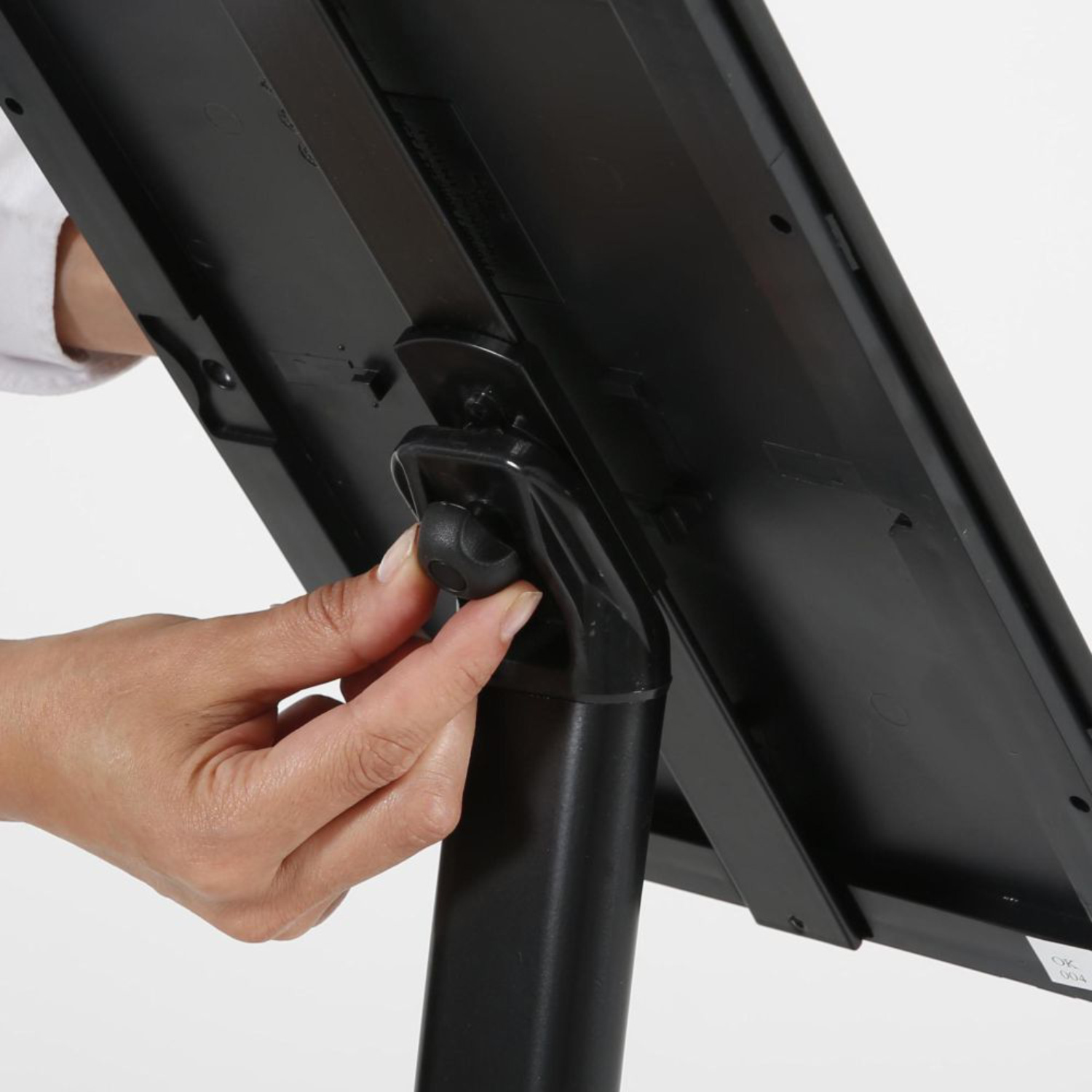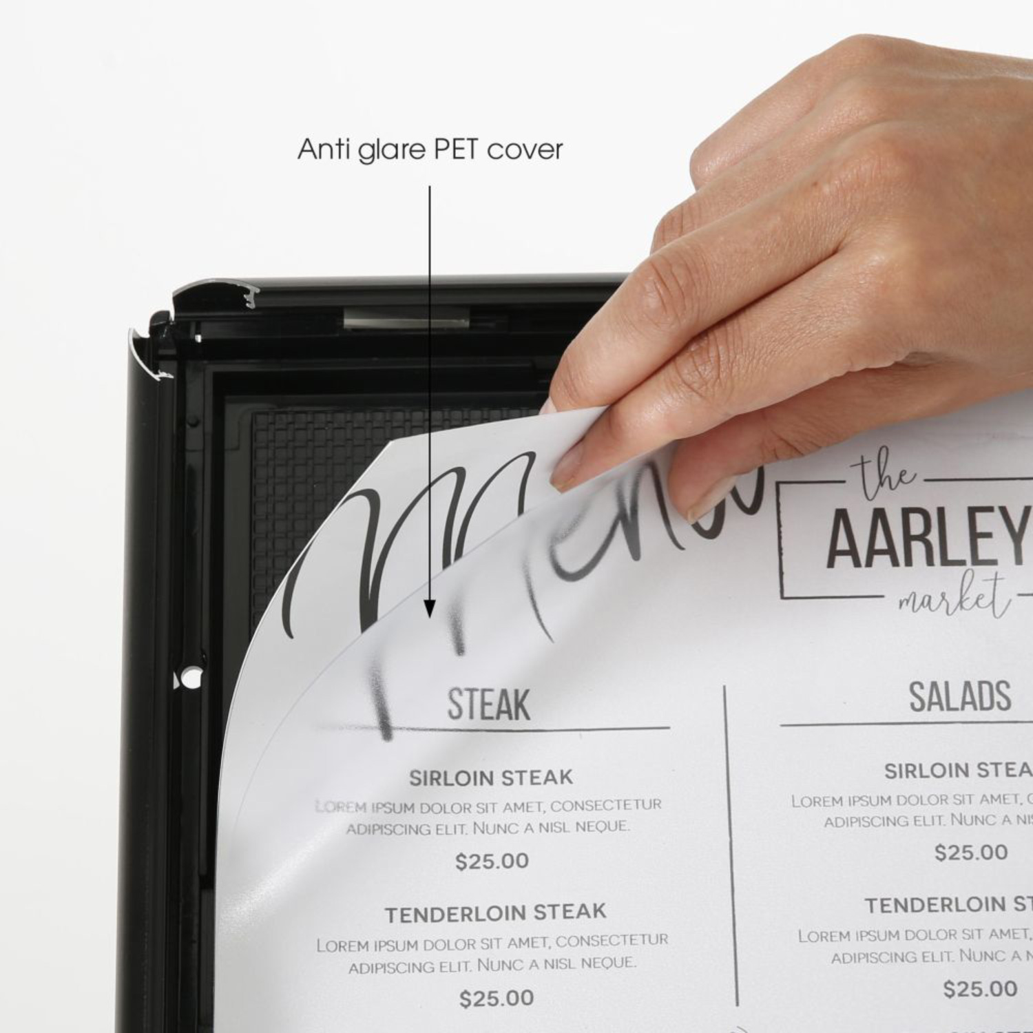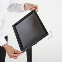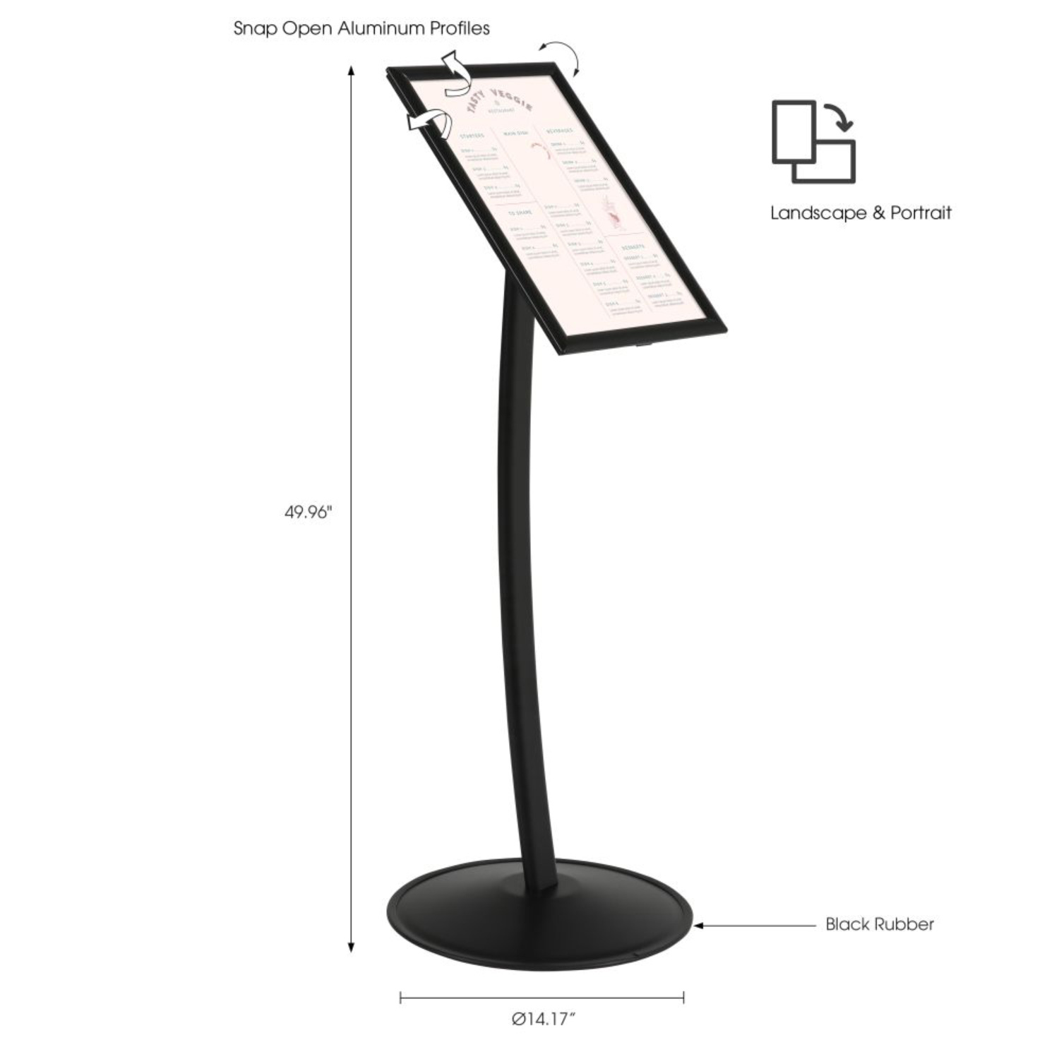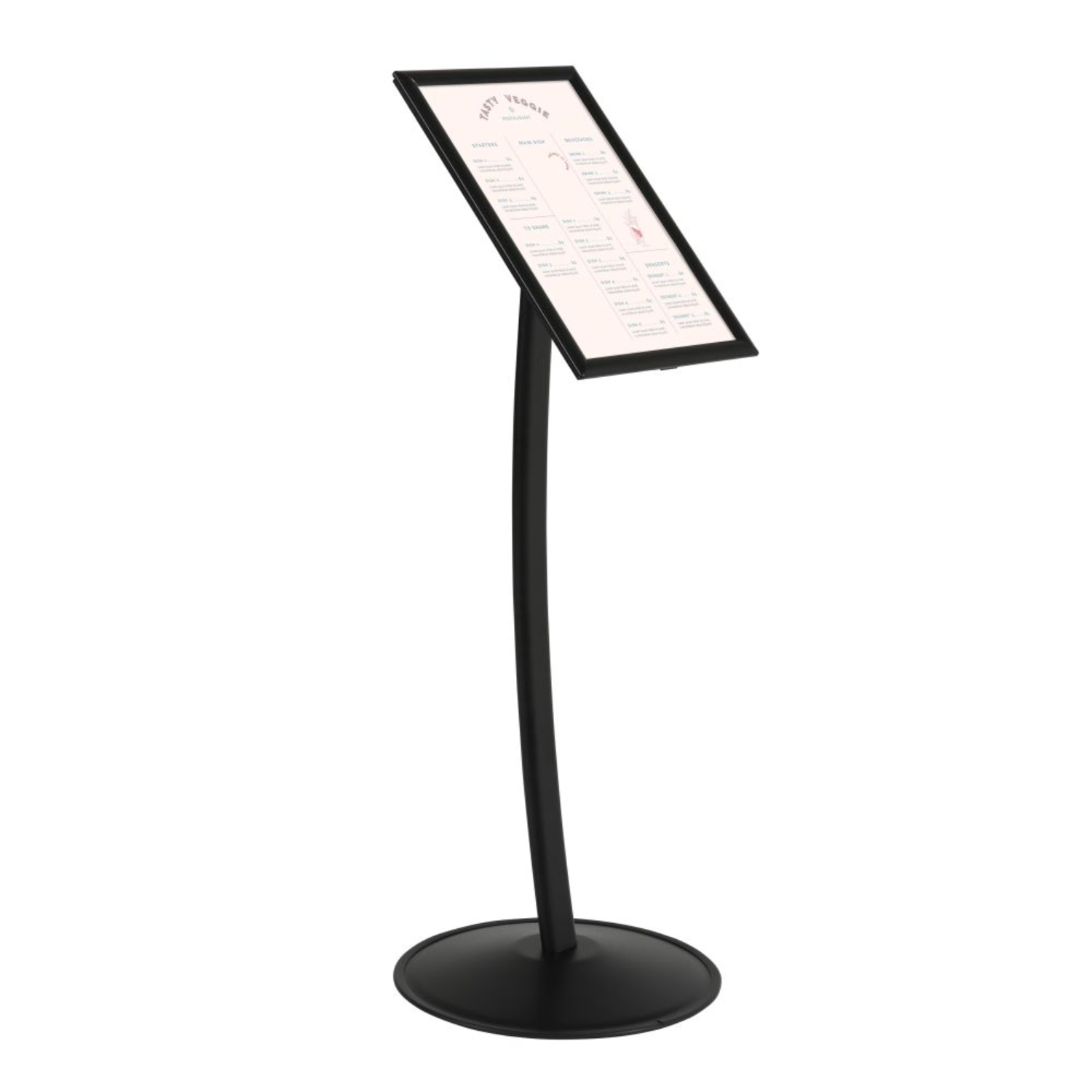 This simplistic curved menu board offers a sleek, modern footprint for 11" x 17" signage. Ideal for directional cues or highlighting specific products in a showroom.