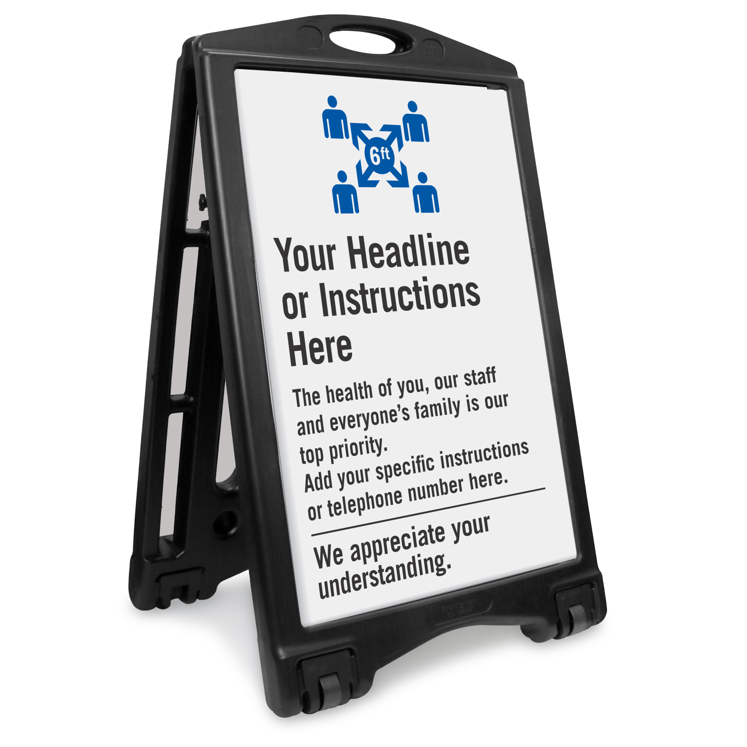 This Custom Social Distancing Sign can be used with a portable BigBoss Sidewalk Sign frame or individually too.