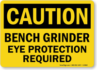 Bench grinders are dangerous pieces of equipment around which one can never be too cautious. Use this caution sign to remind others that eye protection is required when using a bench grinder.