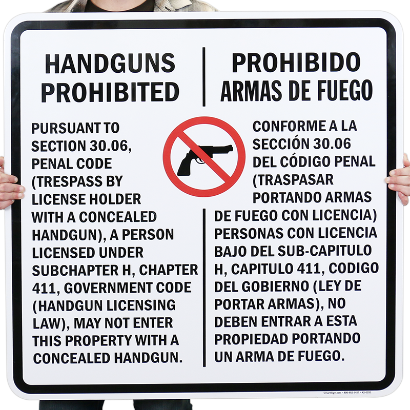 Make sure you have Texas's required concealed carry language posted on your property in compliance with the Texas Penal Code Section 30.06. This Texas gun law sign has legally required language printed in English and Spanish, with 1-inch type.