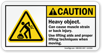Advise workers against lifting heavy objects without mechanical assistance. Stick this ANSI Caution Label on or around heavy material.