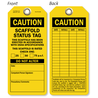 Yellow tags are known as "Caution Tags" and mean that scaffold inspection is done but additional safety is required. Safety inspectors love these plastic Scaffold Status Tags, thanks to their tear-resistance, pull-proof grommet, form-type inspection record table on the back side, and ability to write on the tags.
