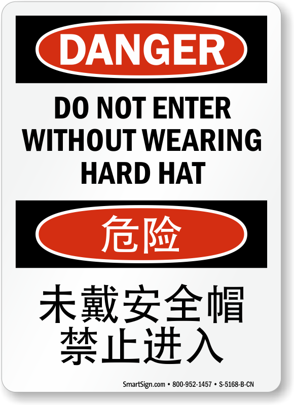 Make sure that your safety message reaches Chinese speaking workers too. This Bilingual OSHA Danger sign reminds everyone to not enter without wearing hard hat.