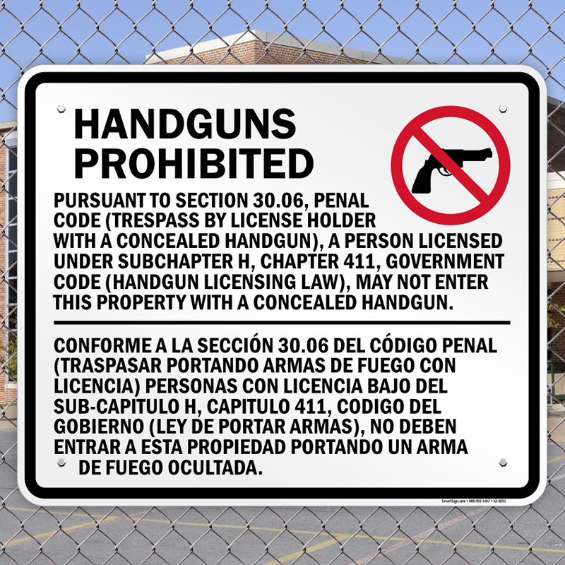 To keep concealed handguns off your property, post this Texas gun law sign with messaging in English and Spanish. It's fully compliant with Section 30.06 of the Texas Penal Code.