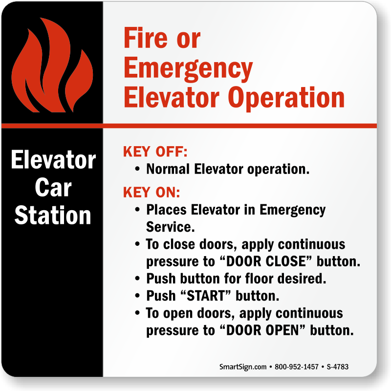 6in. x 6in. Elevator Car Station Sign: Fire Or Emergency Elevator Operation Key Off / Key On To Open Doors