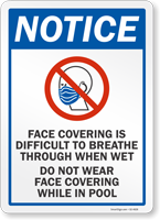 Guide people against wearing face coverings in the pool with this conspicuous sign that flaunts bright colors and an easy-to-understand symbol.