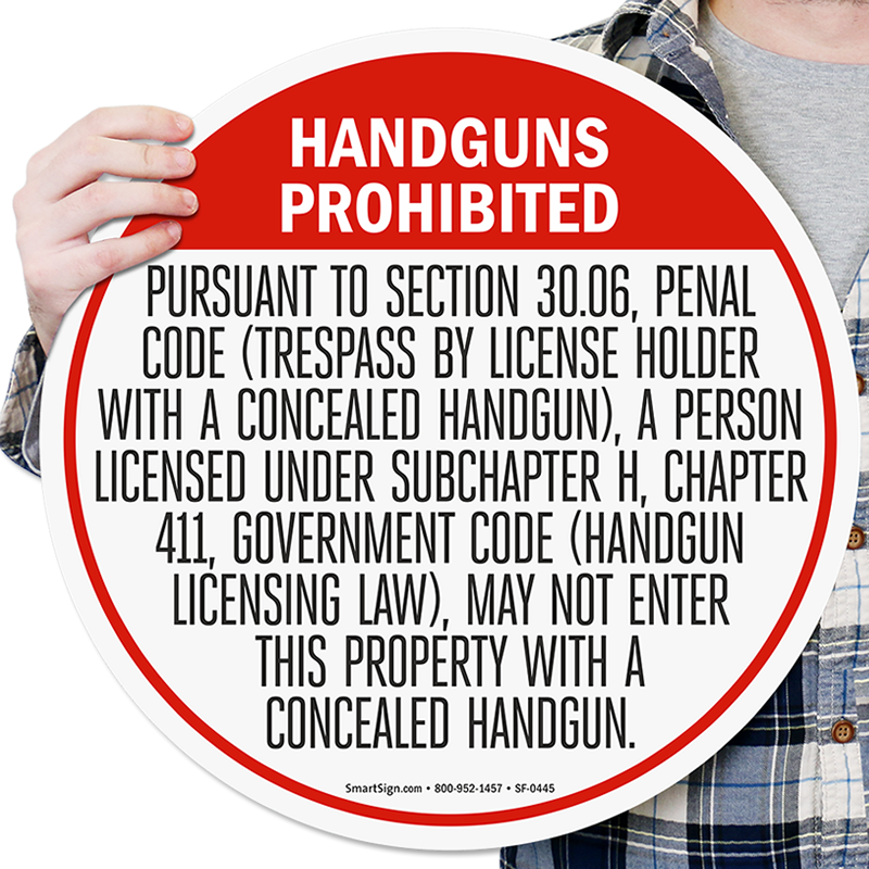 Floor signs can't be missed coz they are right under the nose! This SlipSafeâ„¢ Floor Sign featuring the Concealed Carry of Handguns Prohibited Law (Section 30.06) is ideal for all facility owners in Texas who wish to ban guns on their property.