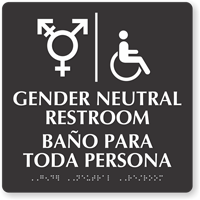 ADA compliant restroom sign with Grade II Braille, raised text in English and Spanish and a distinctive gender neutral and wheelchair symbol.