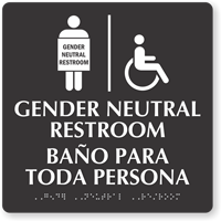 ADA compliant restroom sign with Grade II Braille, raised text in English and Spanish and a distinctive wheelchair symbol.