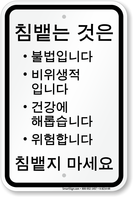 List out the harms of spitting and strictly state your rules to your Korean speaking workers using this Korean No Spitting sign.