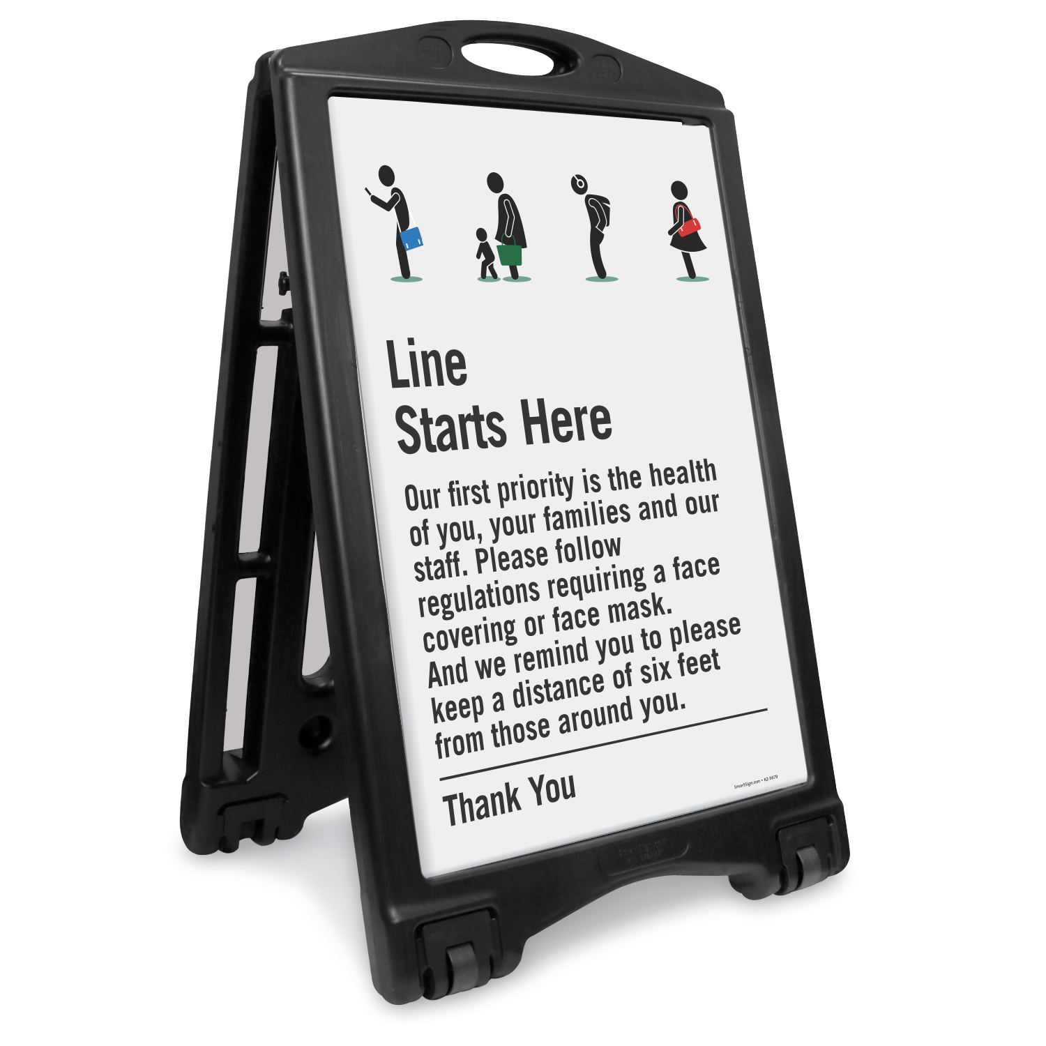 BigBoss A-Frame Portable Sidewalk Sign: Line Starts Here - Please Follow Regulations Requiring A Face Covering, Keep A Distance Of 6 Feet, Thank You