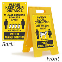 FloorBoss Standing Floor Sign: Maintain Social Distancing - Keep One Cow Apart / 4 Dancing Penguins Apart At Least 6 Feet, Protect Against Infection (SF-0874)