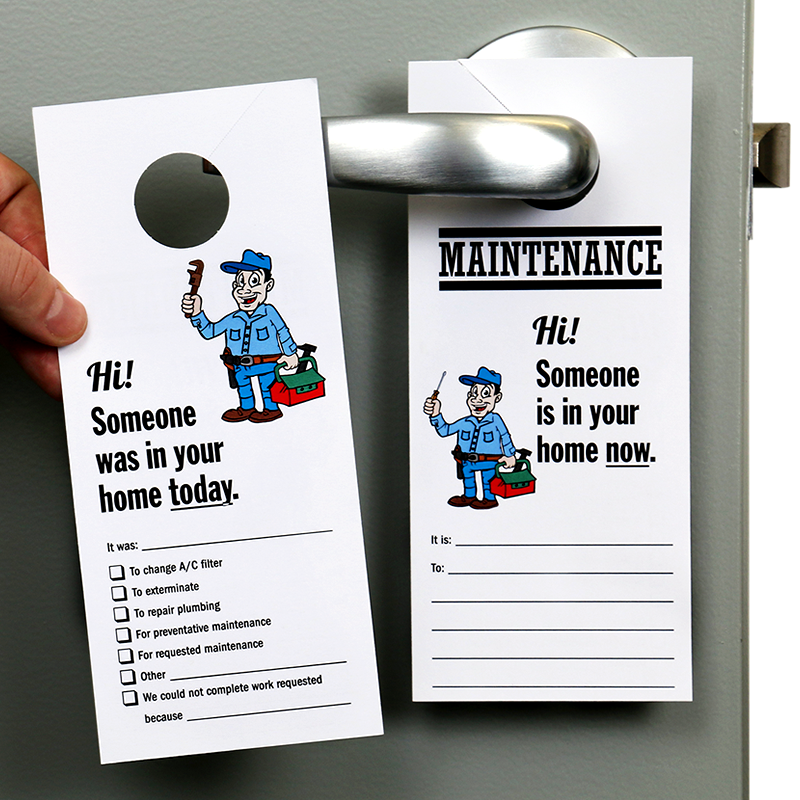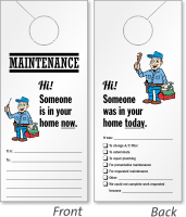 Display the front side of this 2-Sided Apartment Maintenance Door Hanger to inform residents about the presence of maintenance personnel at home, while turn the tag to display the back side and inform that the staff has left after finishing the work.