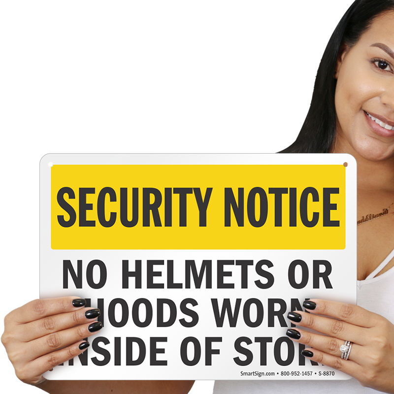 Security Notice Sign: No Helmets Or Hoods Worn Inside Of Store (S-8870)