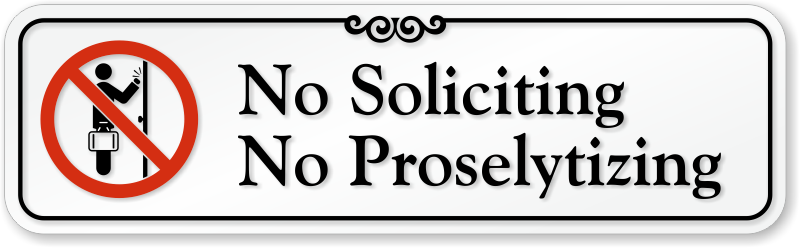 Tired of door-to-door soliciting and proselytizing? Place this wall sign to keep unwanted business and religious propaganda away.