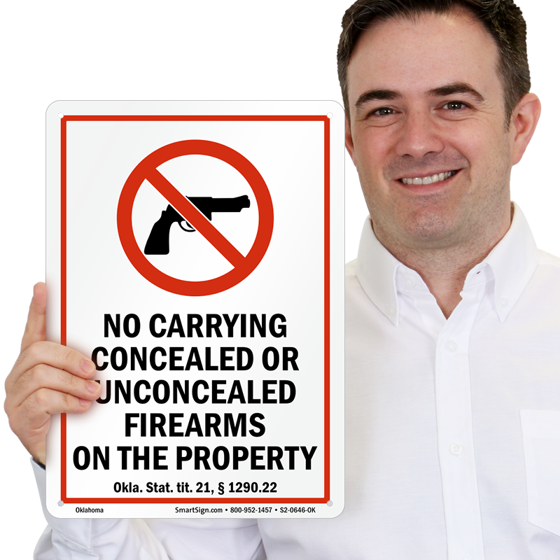 Prevent people from carrying concealed or unconcealed firearms on your property with this Oklahoma Gun Control Law Sign. Sign conforms to Okla. Stat. tit. 21, § 1290.22.