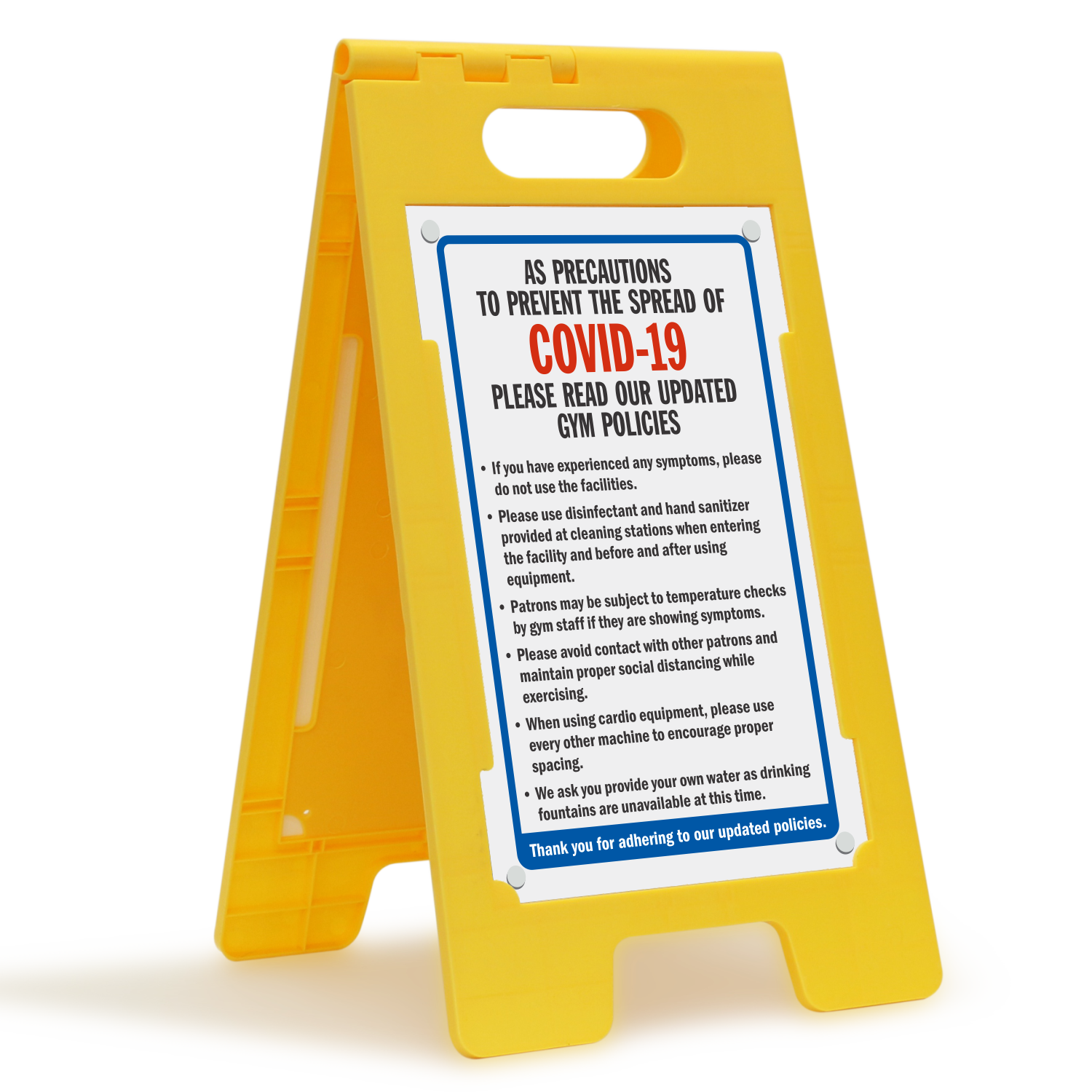 FloorBoss Custom Standing Floor Sign: As Precautions To Prevent The Spread Please Read Our Updated Gym Policies - Add Your Custom Gym Policies