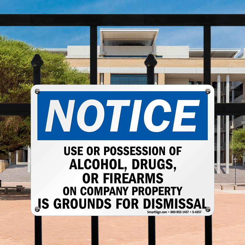 Keep unwanted visitors out. Use a "use or possession of alcohol, drugs or firearms on company property is grounds for dismissal" sign. Improve safety - with a sign!