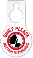 Inform everyone of the ongoing meeting and request them to stay quiet. Use this pear-shaped door hang tag with a finger on the lips graphic. Tag can be easily suspended from a door knob.