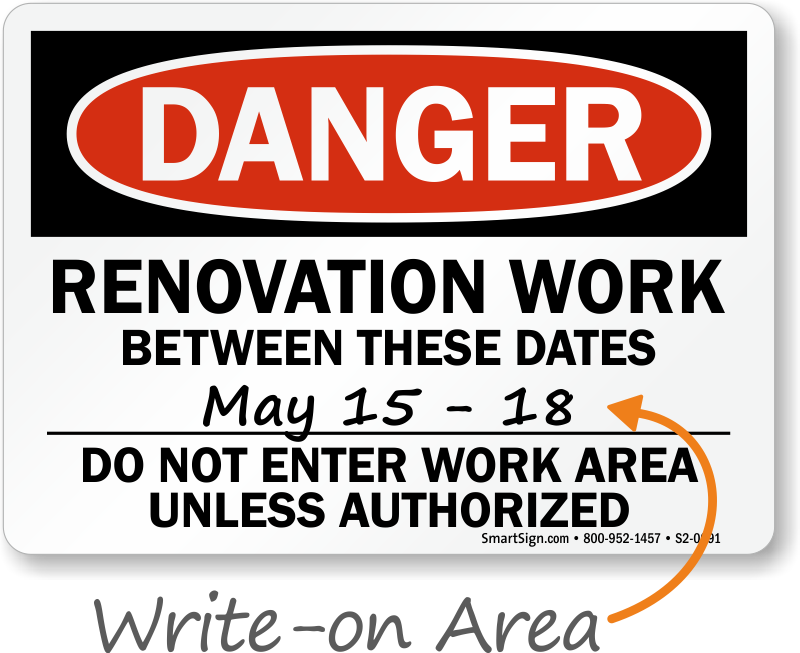 Write-on area on the OSHA Danger sign accepts writings from pen or marker, so you can mention the dates between which renovation work is going to take place and avoid any inconvenience.